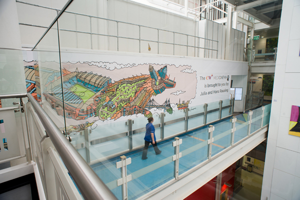 I was recently commissioned to produce two large scale mural works to go on the side of a new purpose built cinema for patients in Chelsea and Westminster Hospital by the CW+ Charity. I was asked to create two colourful murals on either side of it that would be uplifting for the patients to see. They feature lots of local landmarks to spend time looking at and are in the shape of animals. The patients and staff at the hospital helped me to come up with ideas for the places to include and which animal shapes to choose. On one side of the cinema there is a mother and baby rhino made up of buildings such as the Natural History Museum and the Albert Hall and on the other side is a leaping fox made up landmarks from Fulham, Earls Court and Battersea. Below are the digital illustrations of the Rhinos and Fox and also the building sketches I made in researching the pieces along with two initial design ideas.
